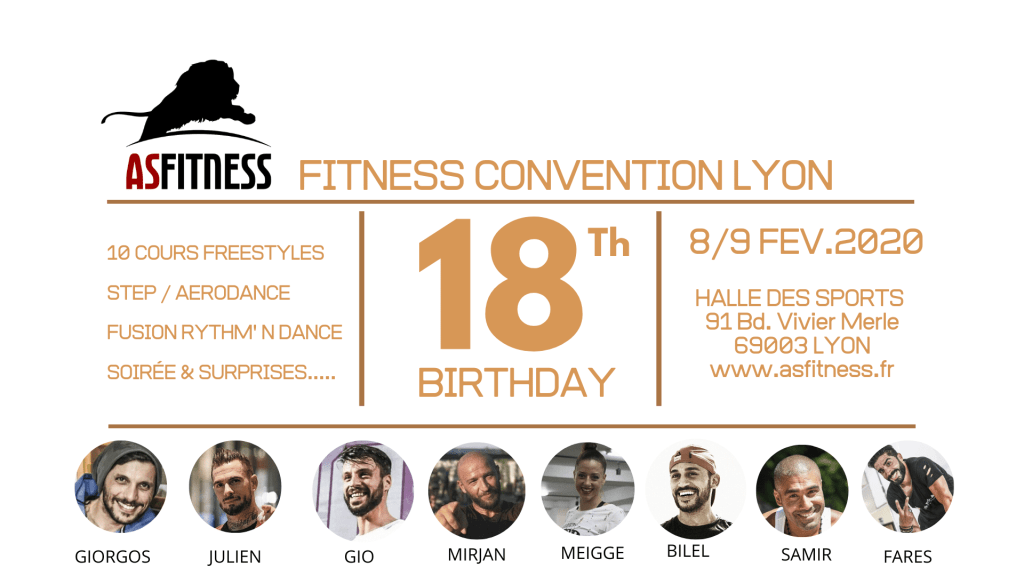 À l’occasion des 18ans de notre association ASFitness, nous vous proposons de nous rejoindre pour un évènement exceptionnel sportif autour du partage. Que vous soyez adhérents ou pas, experts ou novices, venez participer à une convention fitness les 8 et 9 février 2020 à la halle des sports de Lyon.